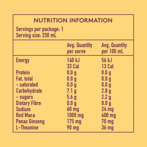 Purified Sparkling Water, Agave Syrup, Natural Flavours (Passionfruit, Lime, Triple Sec, Tequila), Elta Ego™ Bioactive Adaptogen Blend (Red Maca Extract, Panax Ginseng Extract, L-Theanine), Acidity Regulators (Citric Acid, Sodium Citrate), Natural Sweetener (Monk Fruit Juice Concentrate), Natural Thickener (Acacia Gum).