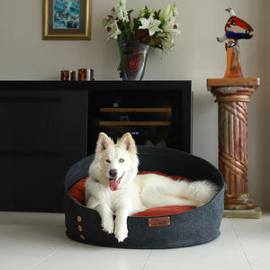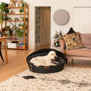Life of Riley's signature wool-filled pod bed! A sleek modern felt pod containing an oval-shaped bed and bolster/snuggle sausage - both filled with NZ Wool. Pure luxury for your dog. This round bed is perfect for dogs who like to snuggle into their bed! The cotton corduroy cushion cover is removable and the bolster is hand washable.
